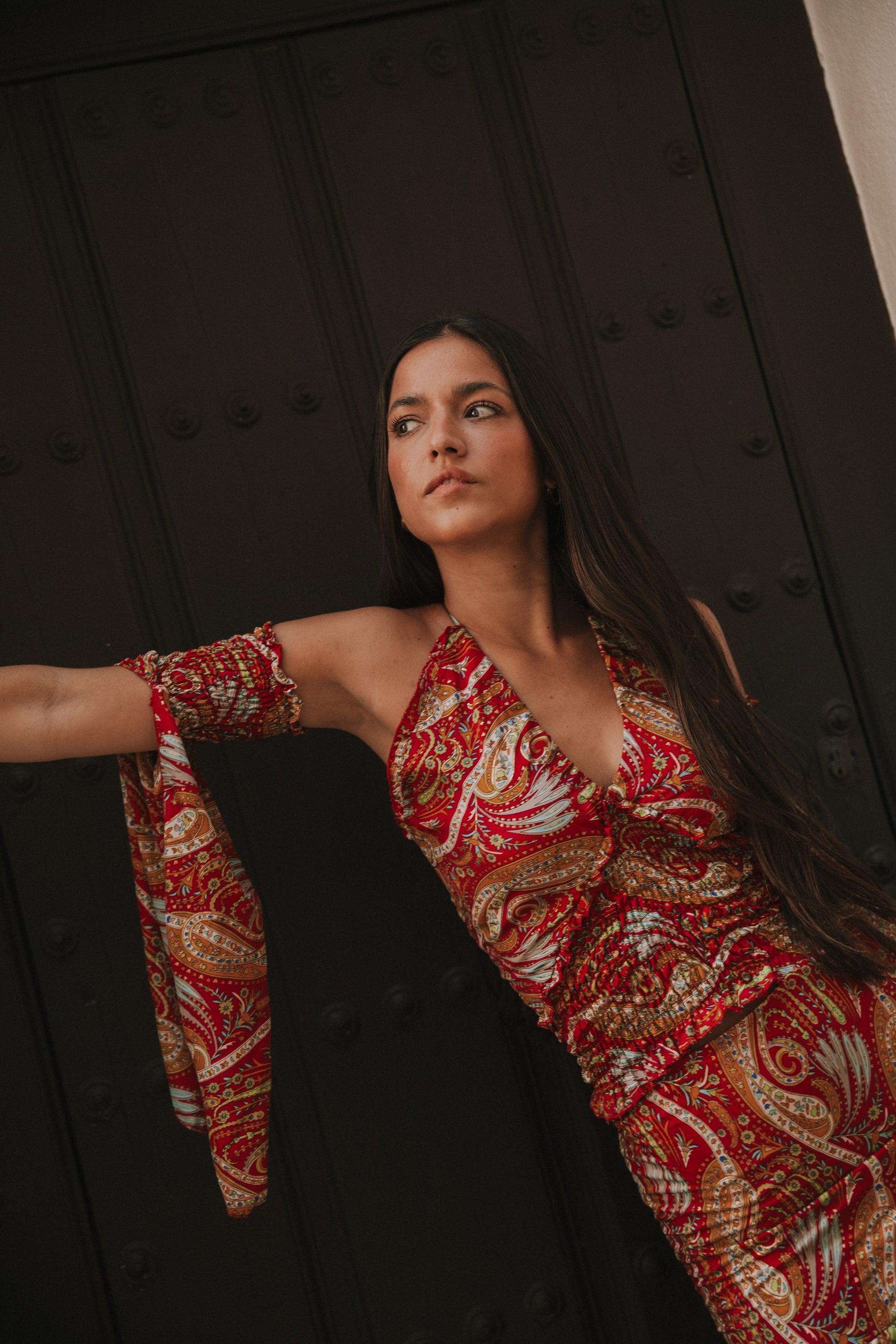 Conjunto confeccionado en seda. Está compuesto de un top con la espalda y parte baja fruncida para adaptarse a varias tallas y formas de cuerpo. Se puede adaptar al cuello de diferentes maneras.