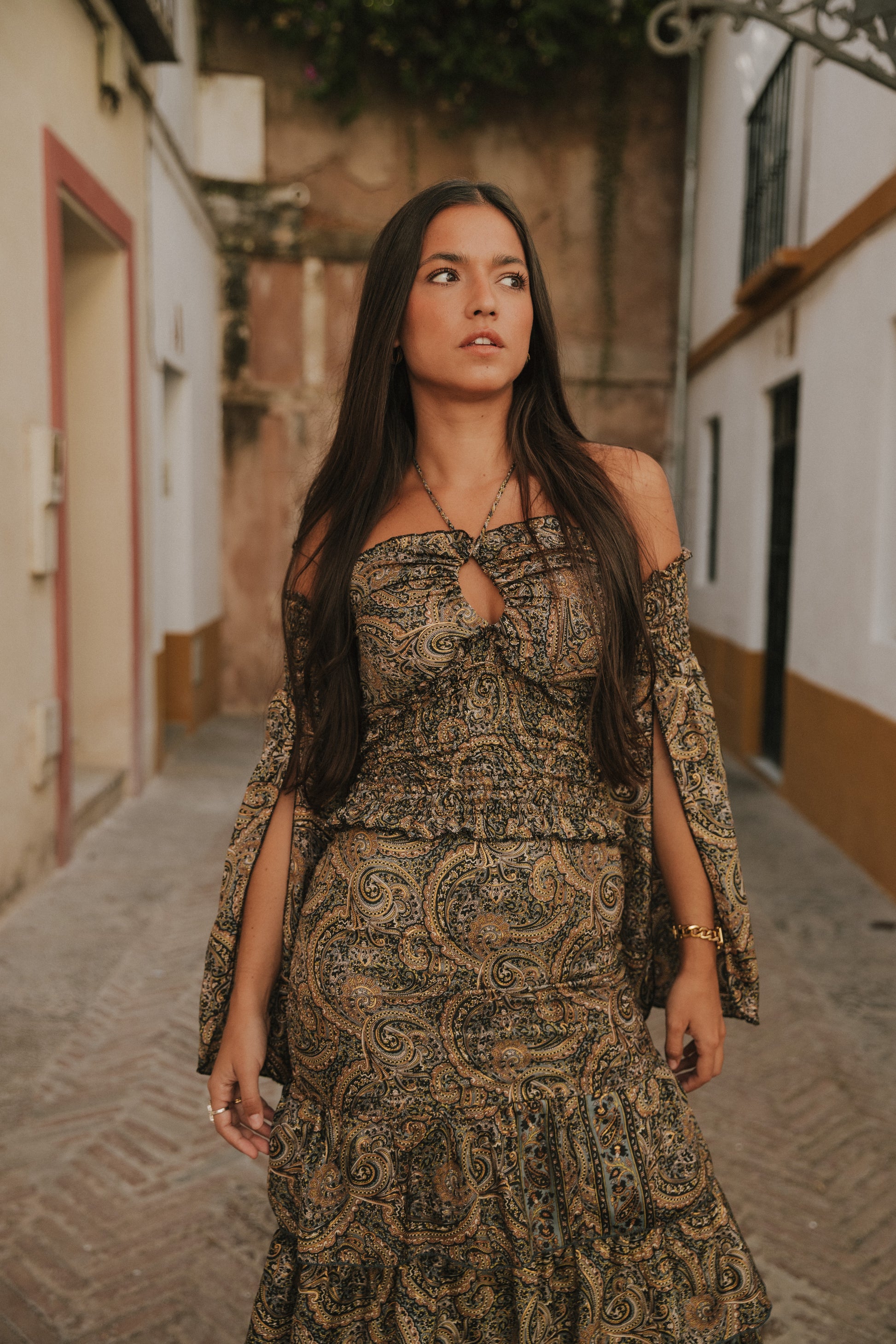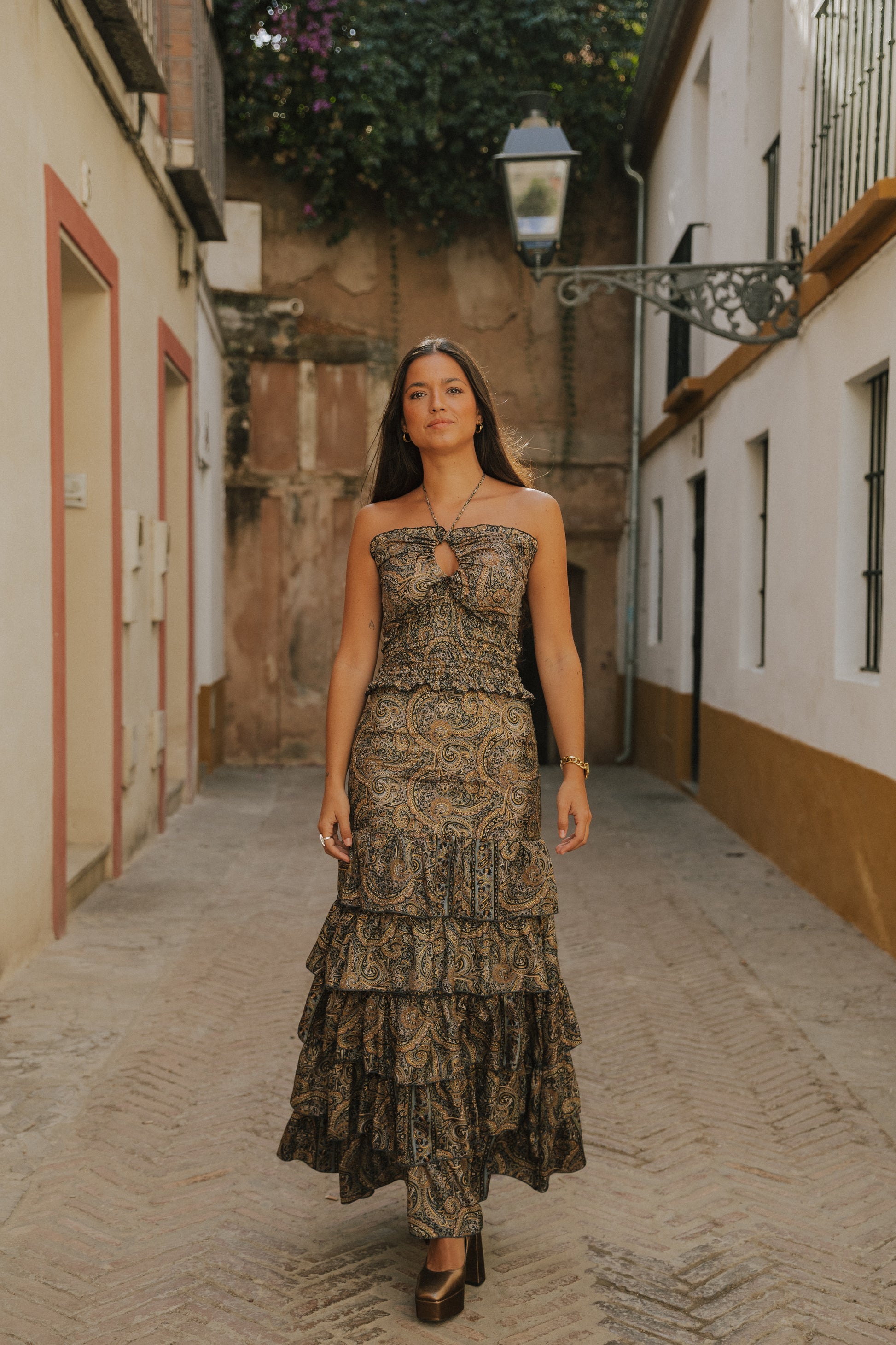 Conjunto confeccionado en seda. Está compuesto de un top con la espalda y parte baja fruncida para adaptarse a varias tallas y formas de cuerpo. Se puede adaptar al cuello de diferentes maneras.