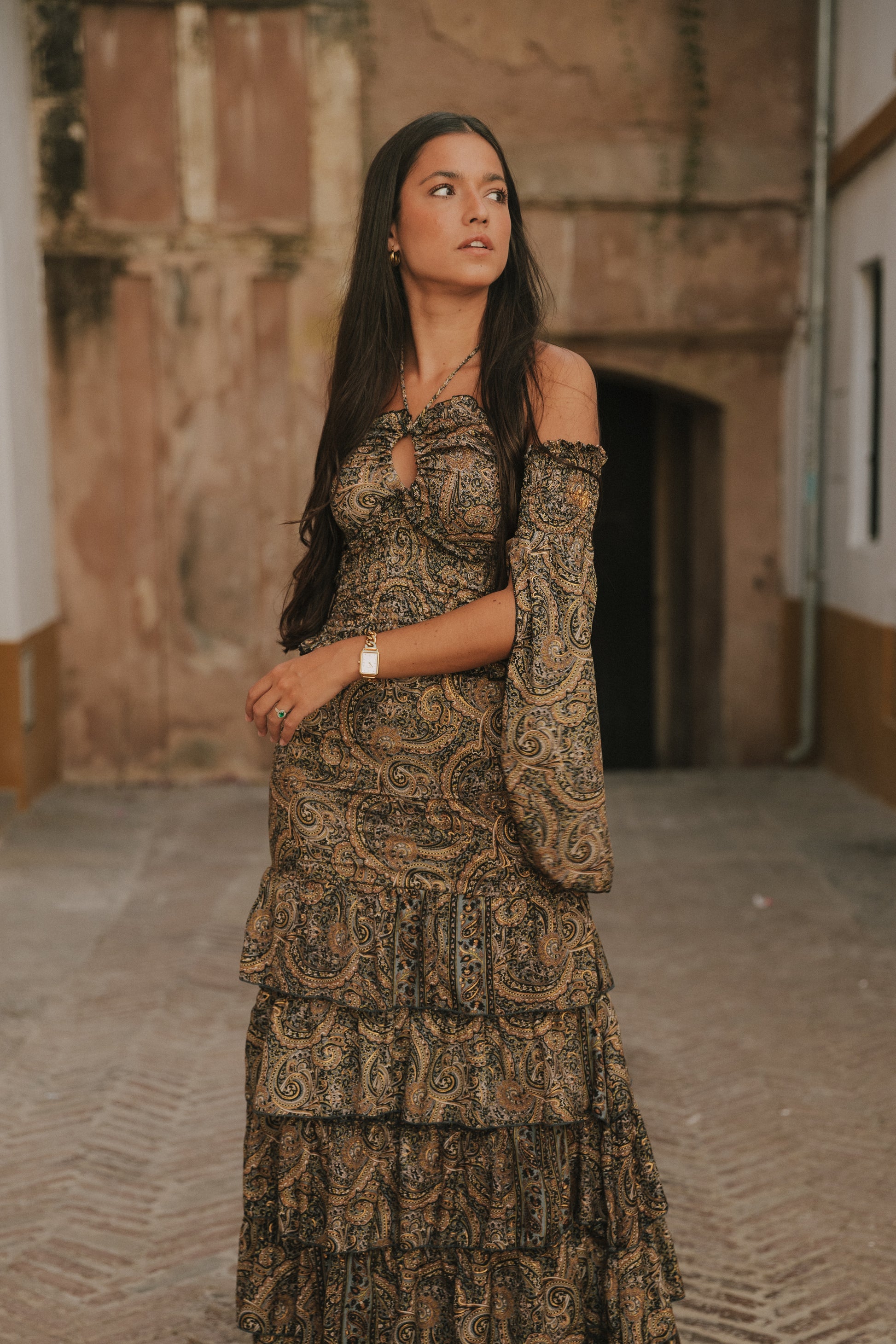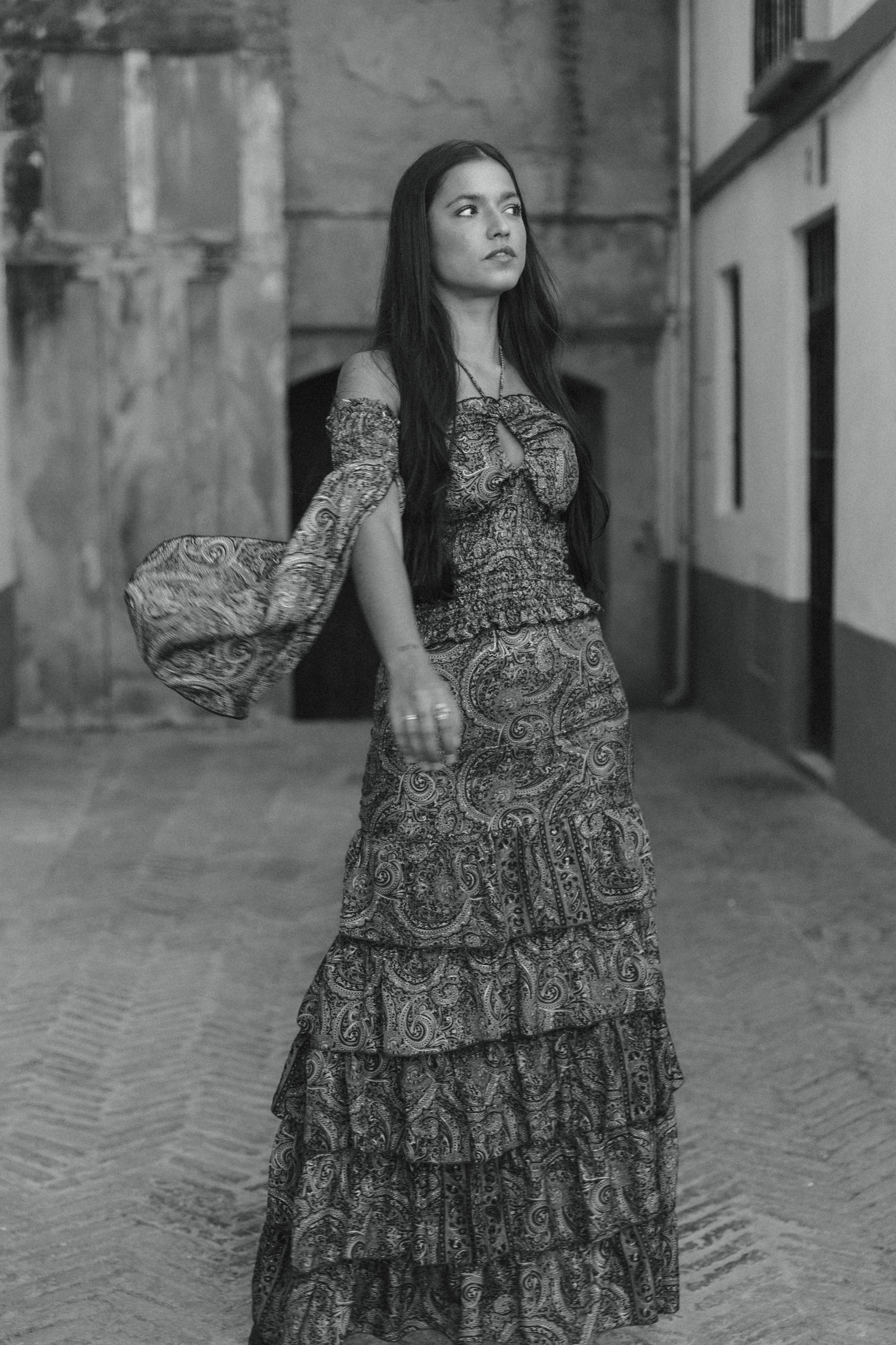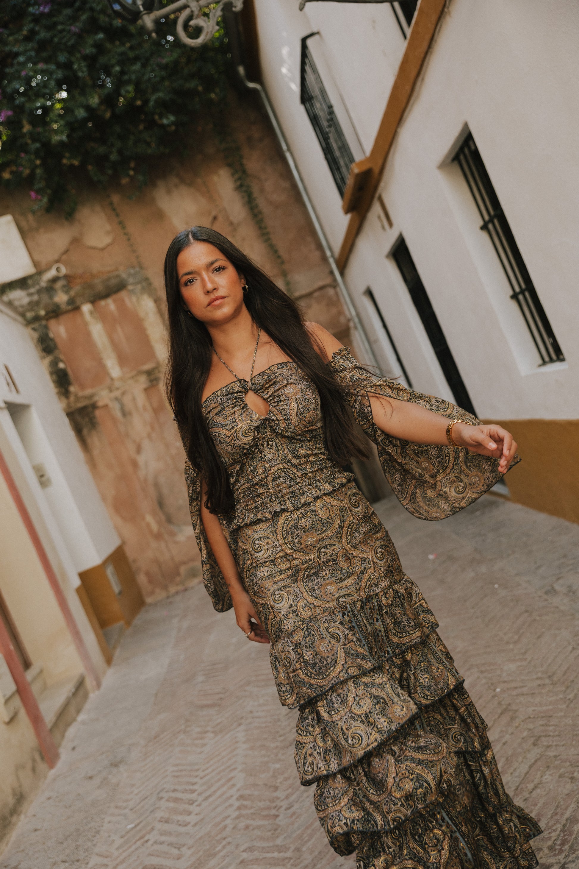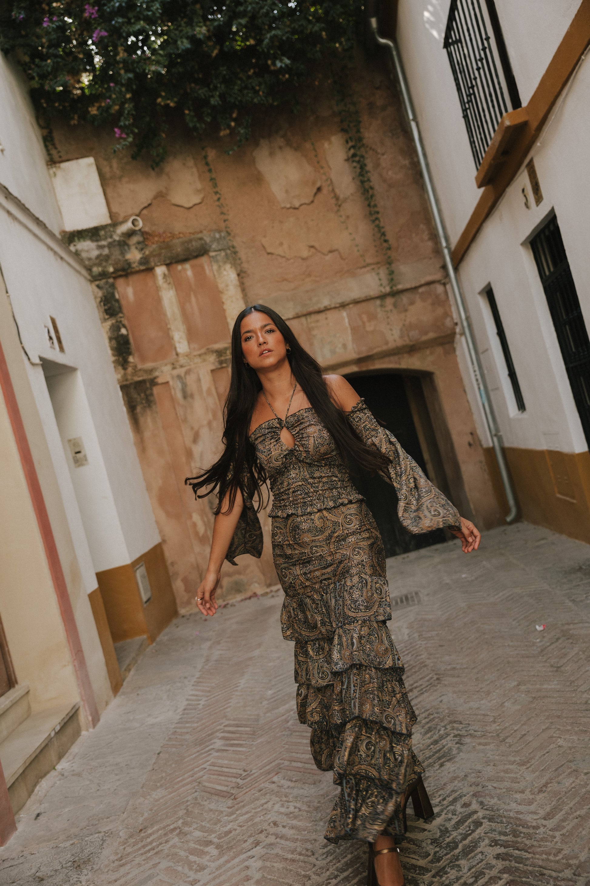 Falda compuesta de 5 volantes en seda. Tiene fruncida la cinturilla de la espalda para adaptarse a varias tallas.