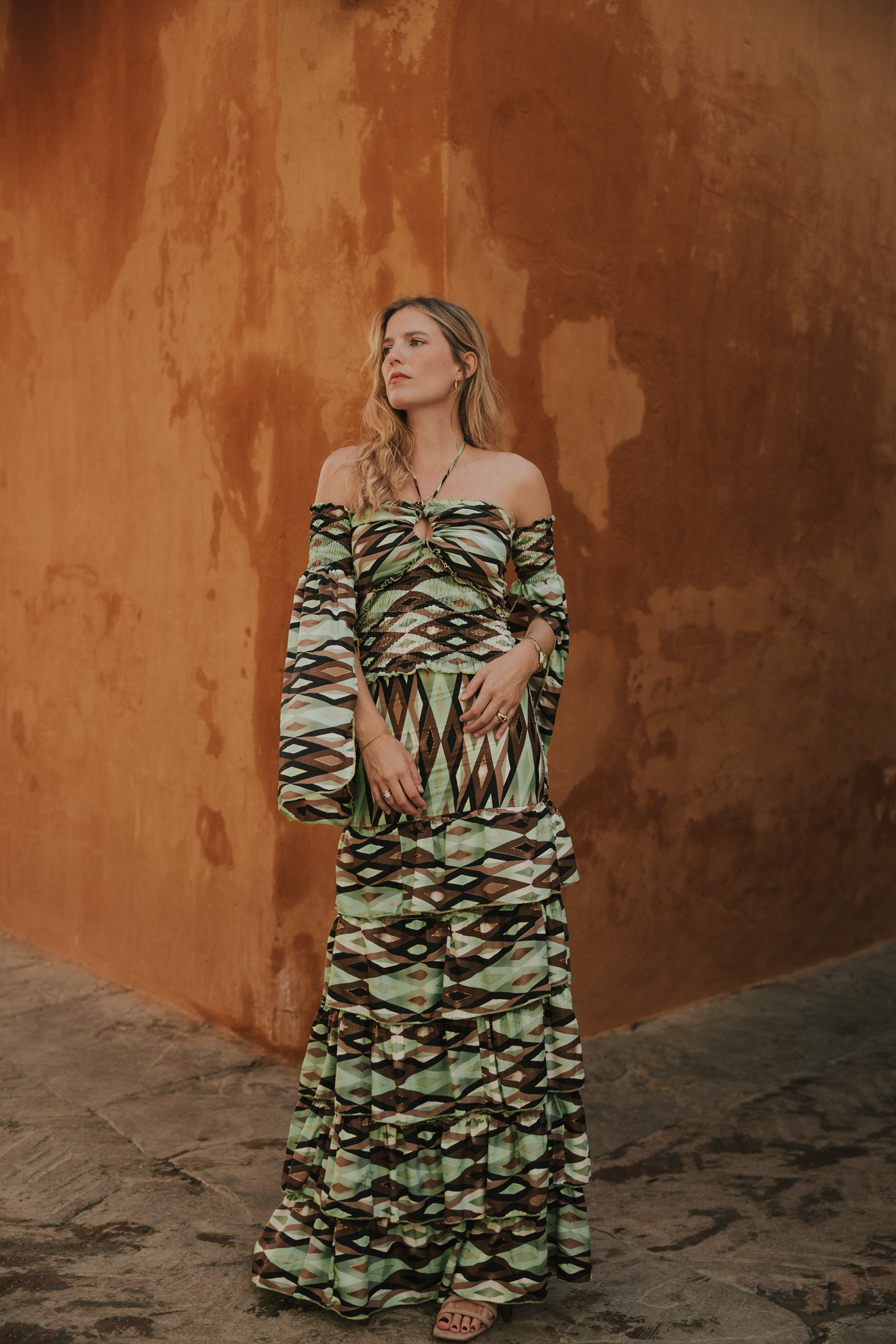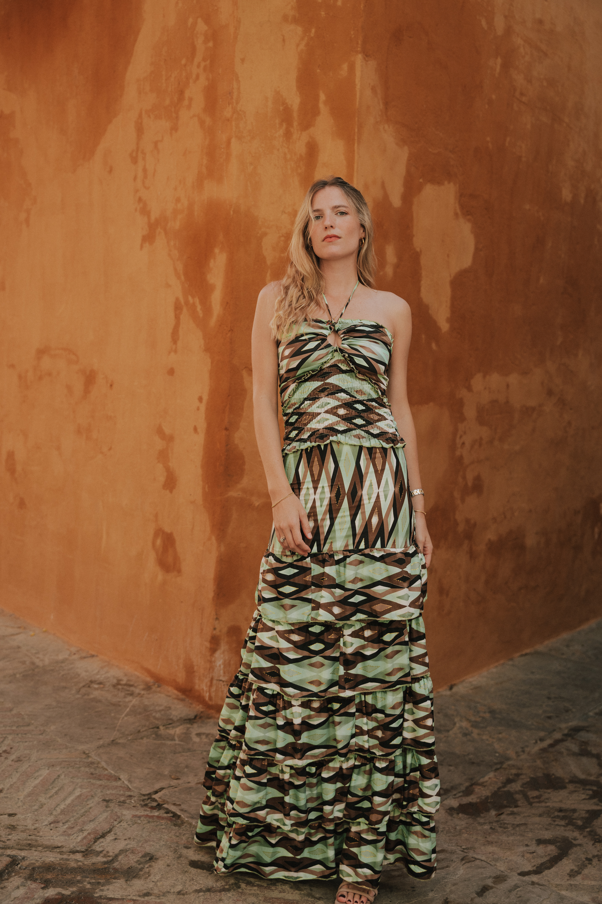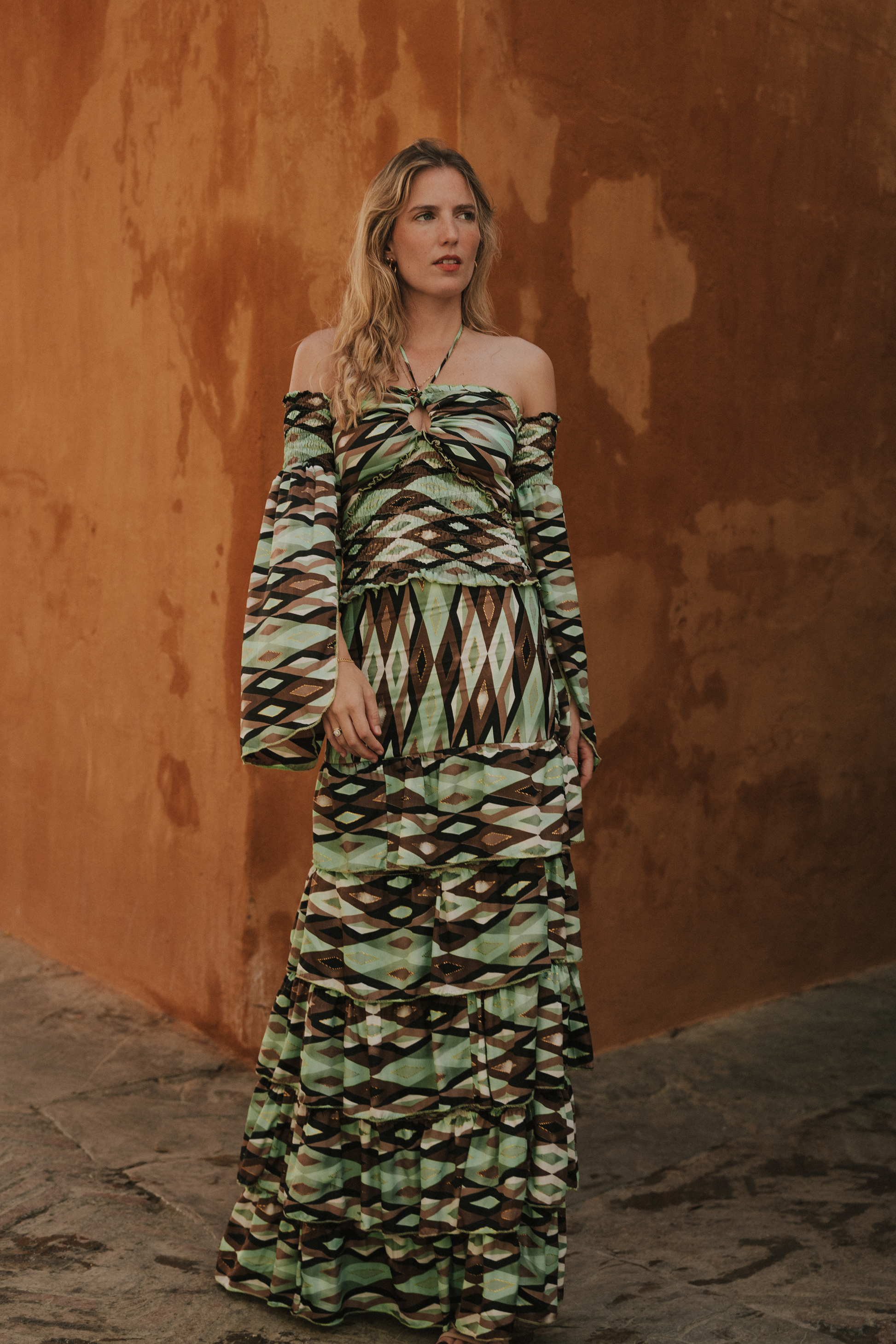 Conjunto confeccionado en seda. Está compuesto de un top con la espalda y parte baja fruncida para adaptarse a varias tallas y formas de cuerpo. Se puede adaptar al cuello de diferentes maneras.
