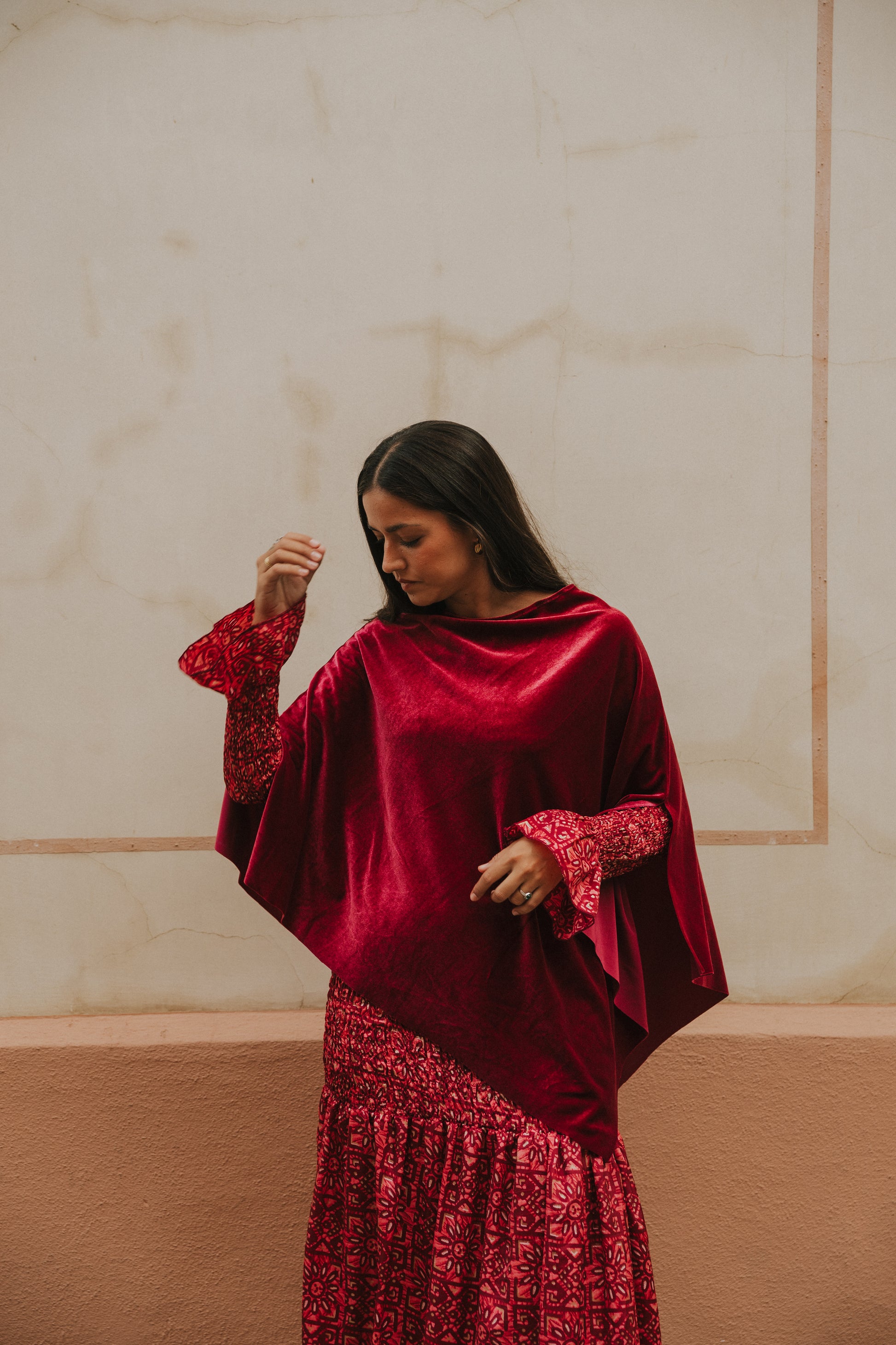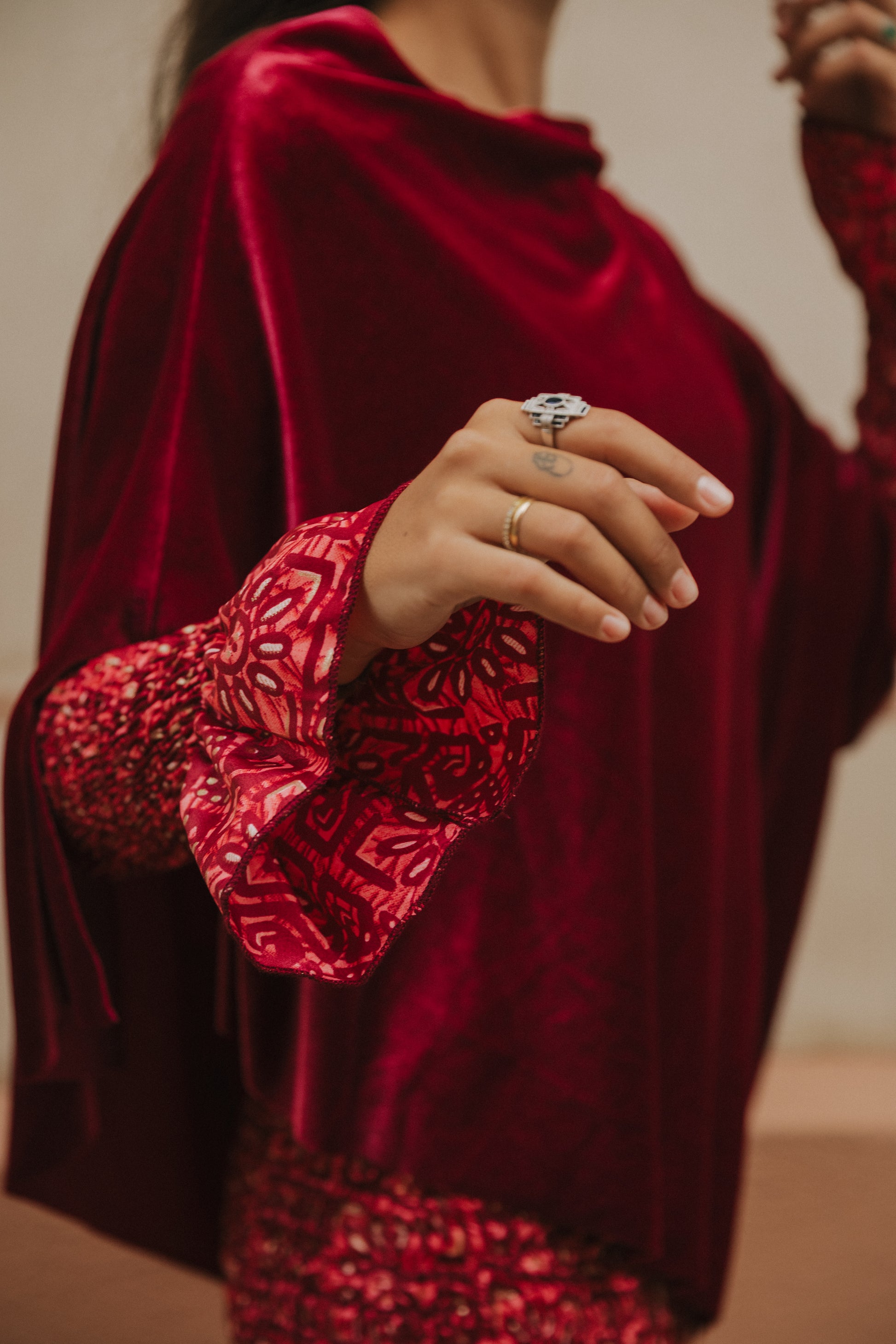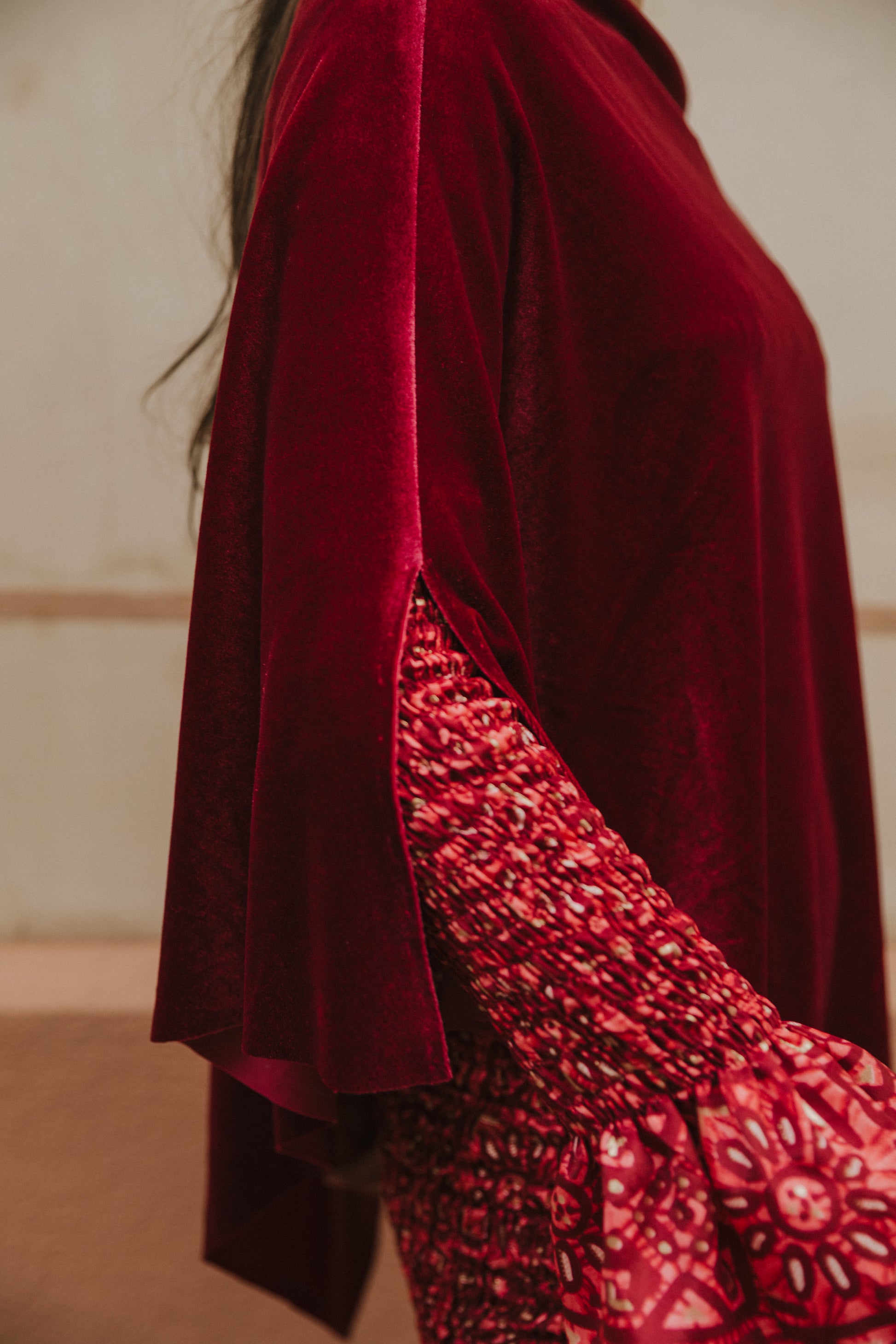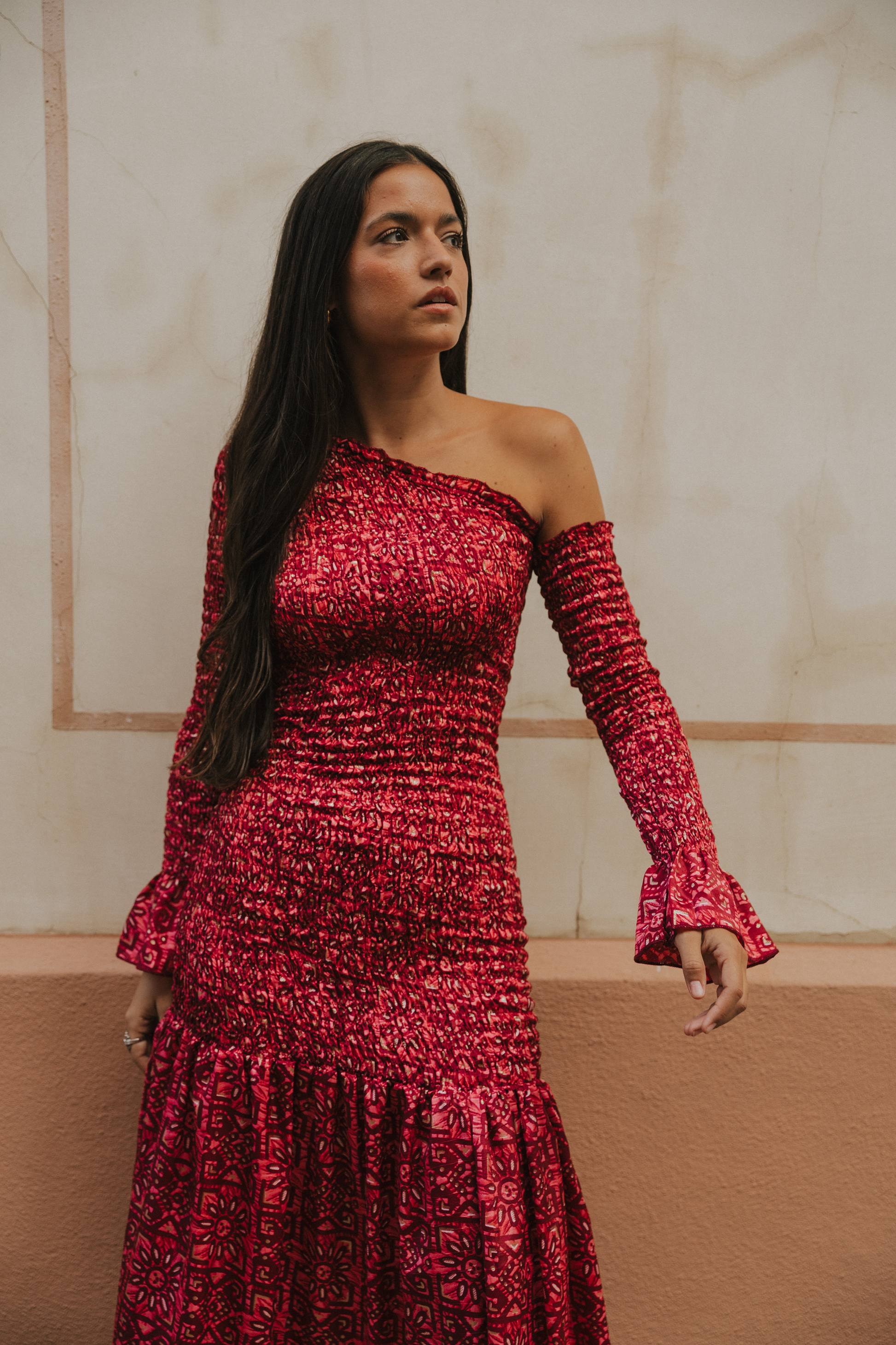 Vestido de manga larga con cuerpo fruncido. Escote redondo también fruncido. A la altura de la cadera se abre en falda.