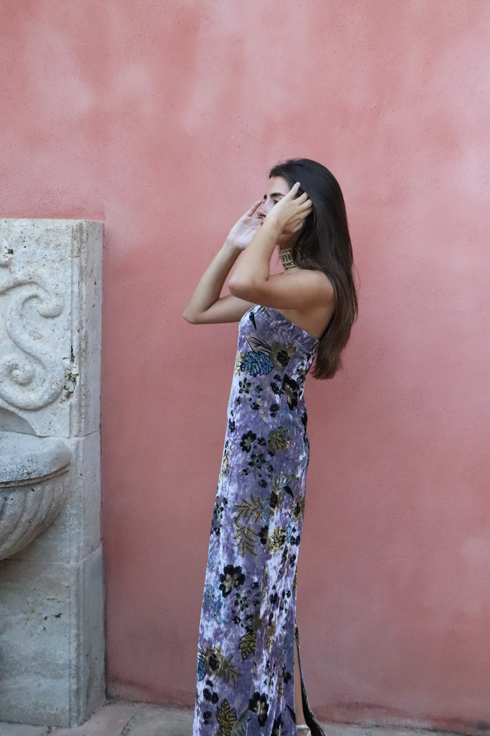 Vestido de confección elaborado en tela de terciopelo y gasa. Este vestido tiene múltiples posibilidades de combinación, entre ellas las mangas o gasa con el que complementarlo.