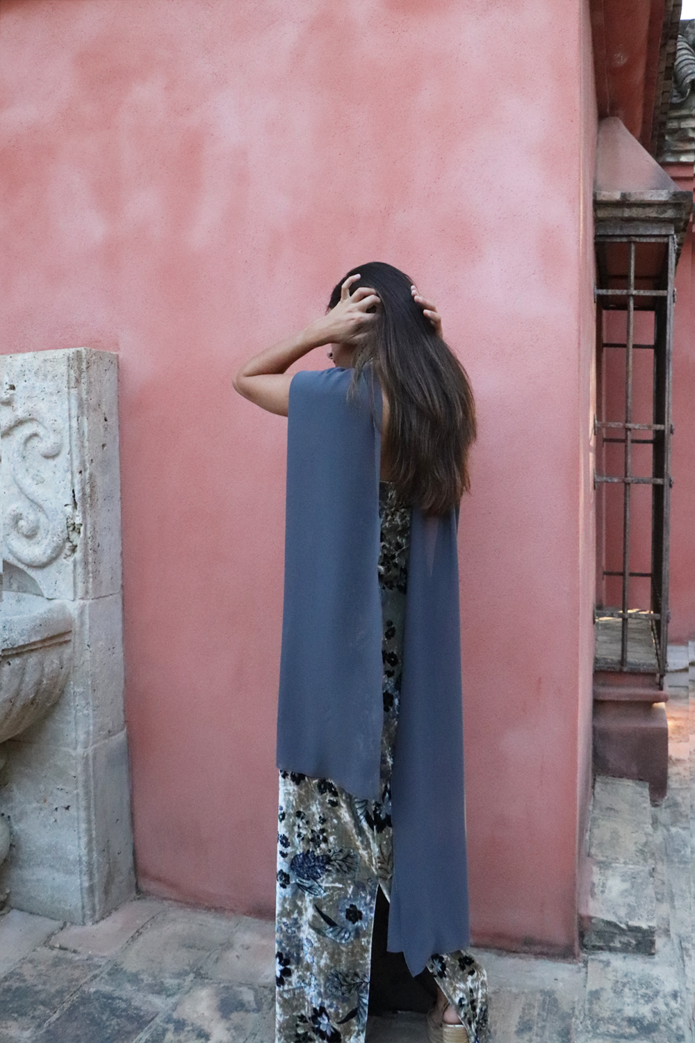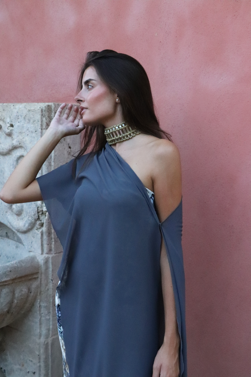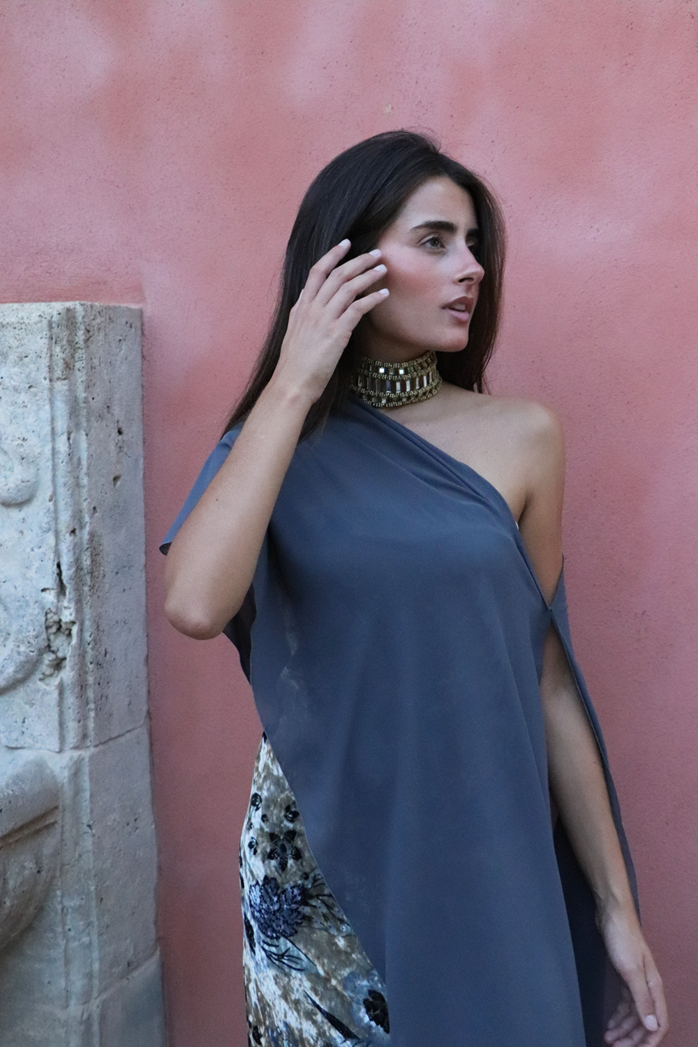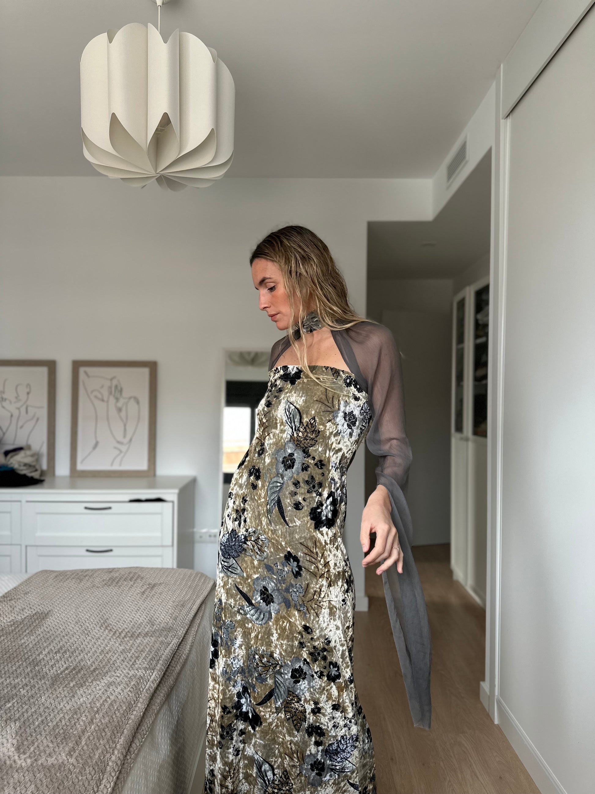 Vestido de confección elaborado en tela de terciopelo y gasa. Este vestido tiene múltiples posibilidades de combinación, entre ellas las mangas o gasa con el que complementarlo.