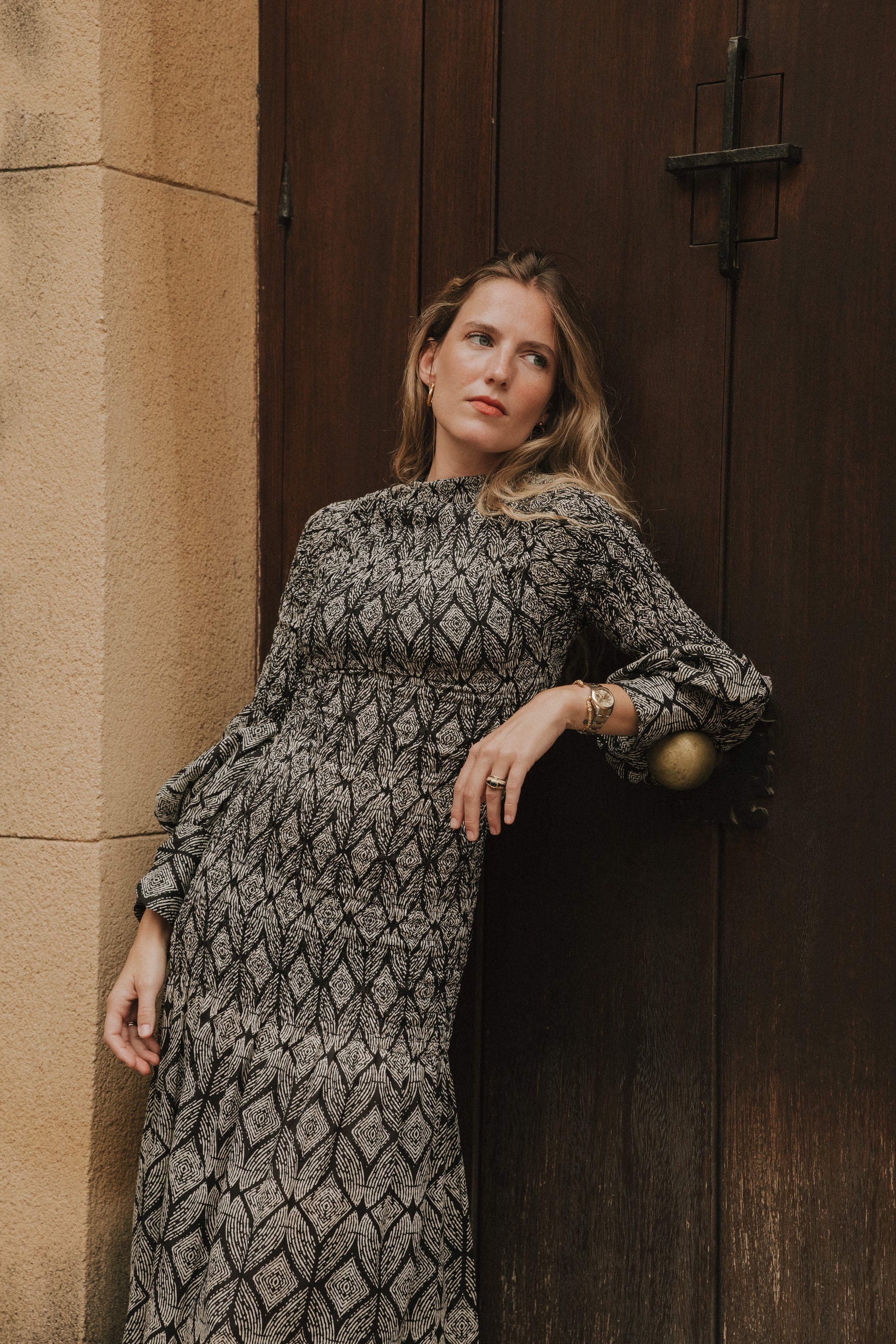 Vestido de manga larga con cuerpo fruncido. Escote redondo también fruncido. A la altura de la cadera se abre en falda.